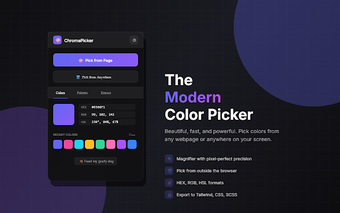 ChromaPickerは、デザイナーと開発者のために設計されたChrome用の高度なカラーピッカー拡張機能です。この無料ツールは、ユーザーが任意のウェブページから正確に色を瞬時に選択できるようにし、色の選択精度を高めるピクセルパーフェクトの拡大鏡を利用しています。ユーザーは、HEX、RGB、HSLなどのさまざまな形式で色を直接コードにコピーできるため、プロジェクトにとって時間を節約できる資産となります。